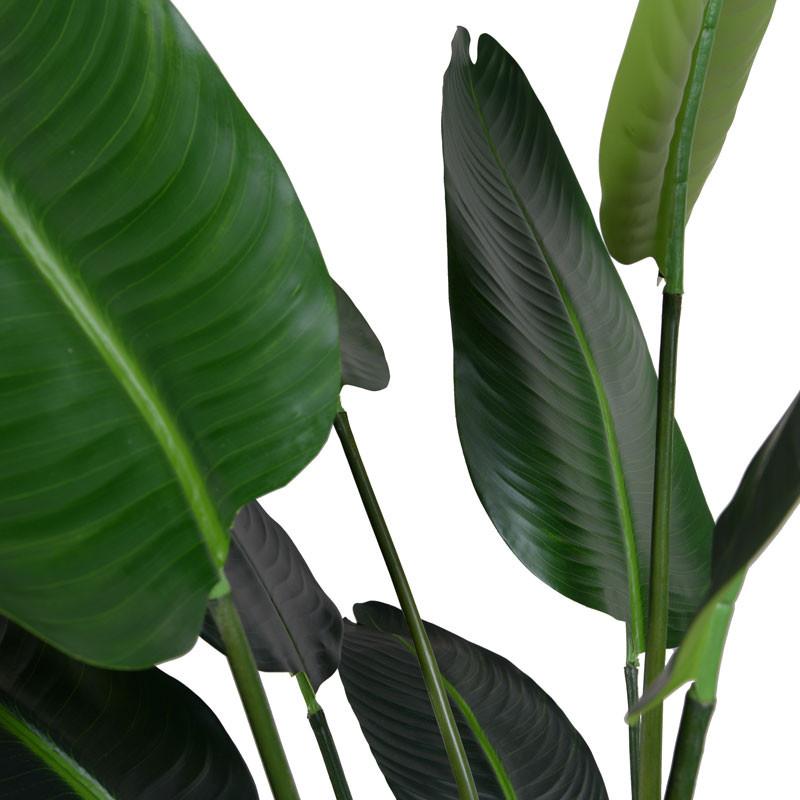 Artificial Traveller's Palm tree stands 10 feet tall in a 13" mache pot. Mount into one of our tree planters, or use your own decorative pot to add even more dramatic height to interiors. This popular faux tree has large leaves attached to strong stalks.