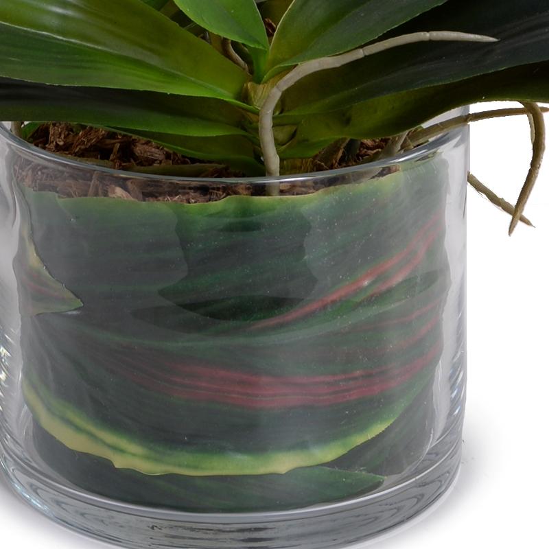 Lifelike white-purple Phalaenopsis Orchid stems are made with Leaf It, our innovative leaf-wrapped assembly (patent pending) that is removable from the vase, to allow for easy cleaning of the glass, or display in your own vase, or an alternate planter. The striking flower stems are secured with bark wire to natural black bamboo stakes, and ship inside our heavy, 8 inch low glass bowl. 26 inch overall height.