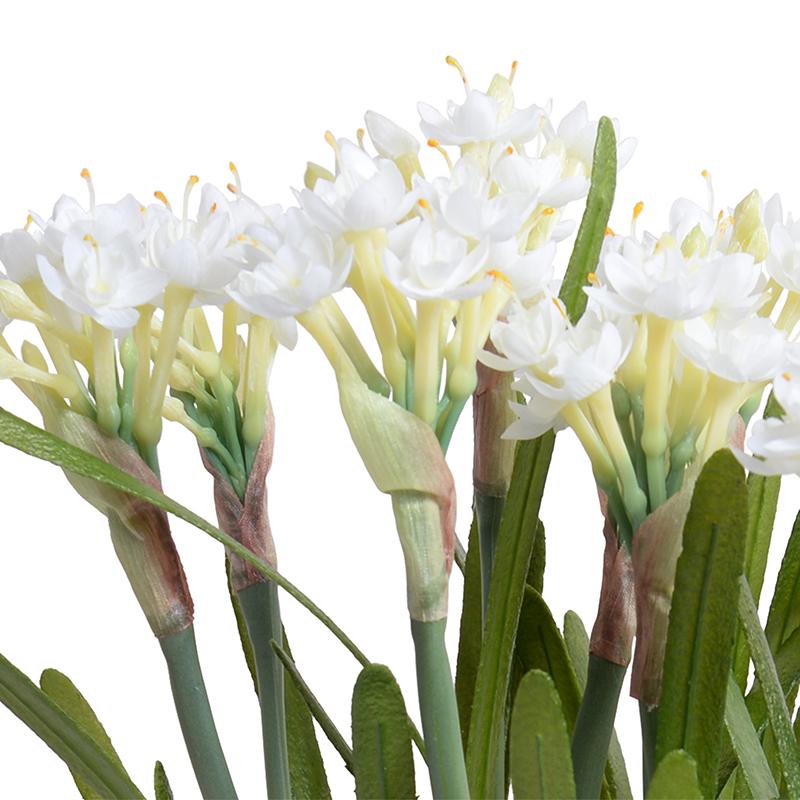 Four blooming Paperwhite Narcissus artificial bulb plants are carefully placed in natural stones and permanently set with clear acrylic. This faux arrangement adds classic winter blooms without the scent! The heavy, mouth blown glass vase measures 5"L x 5"W x 4.75"H. The finished arrangement measures 6"L x 6"W x 14"H.