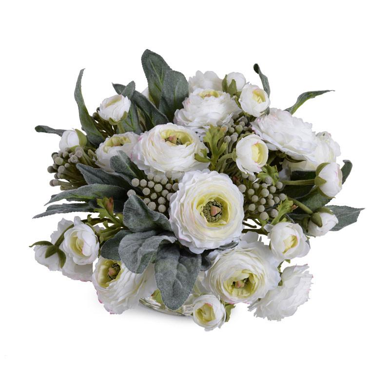 A New Growth Designs Faux Fresh Bouquet of neutral whites and greys makes a lovely small centerpiece. With artificial white Ranunculus and the silvery grey tones of Lamb's Ear and Silver Brunia artfully arranged in clear acrylic "water" in our heavy mouth-blown 5" glass cube vase.