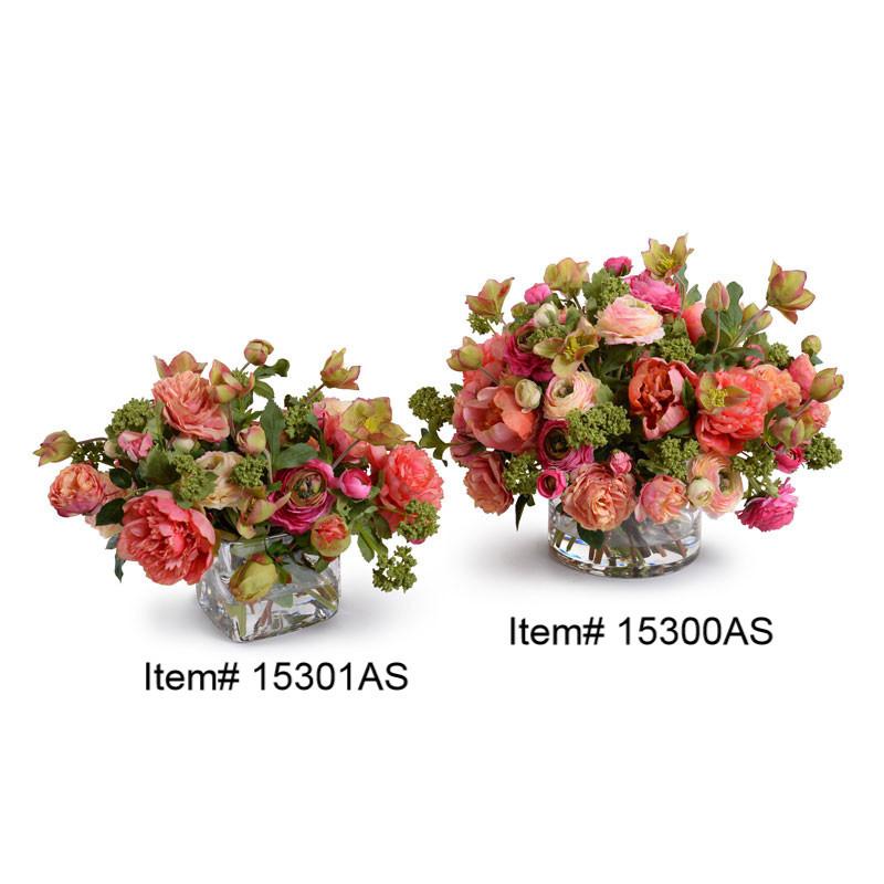 New Growth Designs Faux Fresh arrangements add realistic floral accent with little maintenance. This striking bouquet includes shades of peach, coral, fuchsia and green in a mixed bounty of flowers which are artfully arranged by hand in clear acrylic "water" into our heavy mouth-blown 5" cube glass vase.