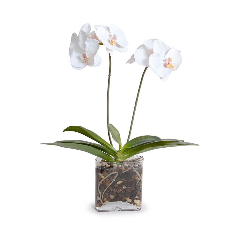 We're loving this new Phalaenopsis orchid arrangement! In a small glass envelope vase filled with small natural stones, Ed Glenn has arranged two lifelike orchid stems and faux leaves. Each perfectly shaped faux stem has 4 large white flowers. The roots extend into the stone, and all is anchored with acrylic "water" solution for realism.