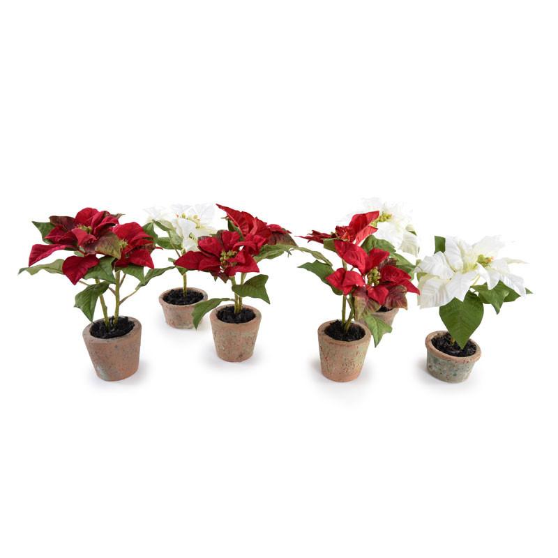 This simple faux Mini-Poinsettia plant will spread holiday cheer and last for seasons to come. Each lifelike green and red flower is planted by hand in a 3" terra cotta tom pot and set in our signature faux dirt mixture. Overall dimensions: 6" diameter x 9" high. Sold individually.